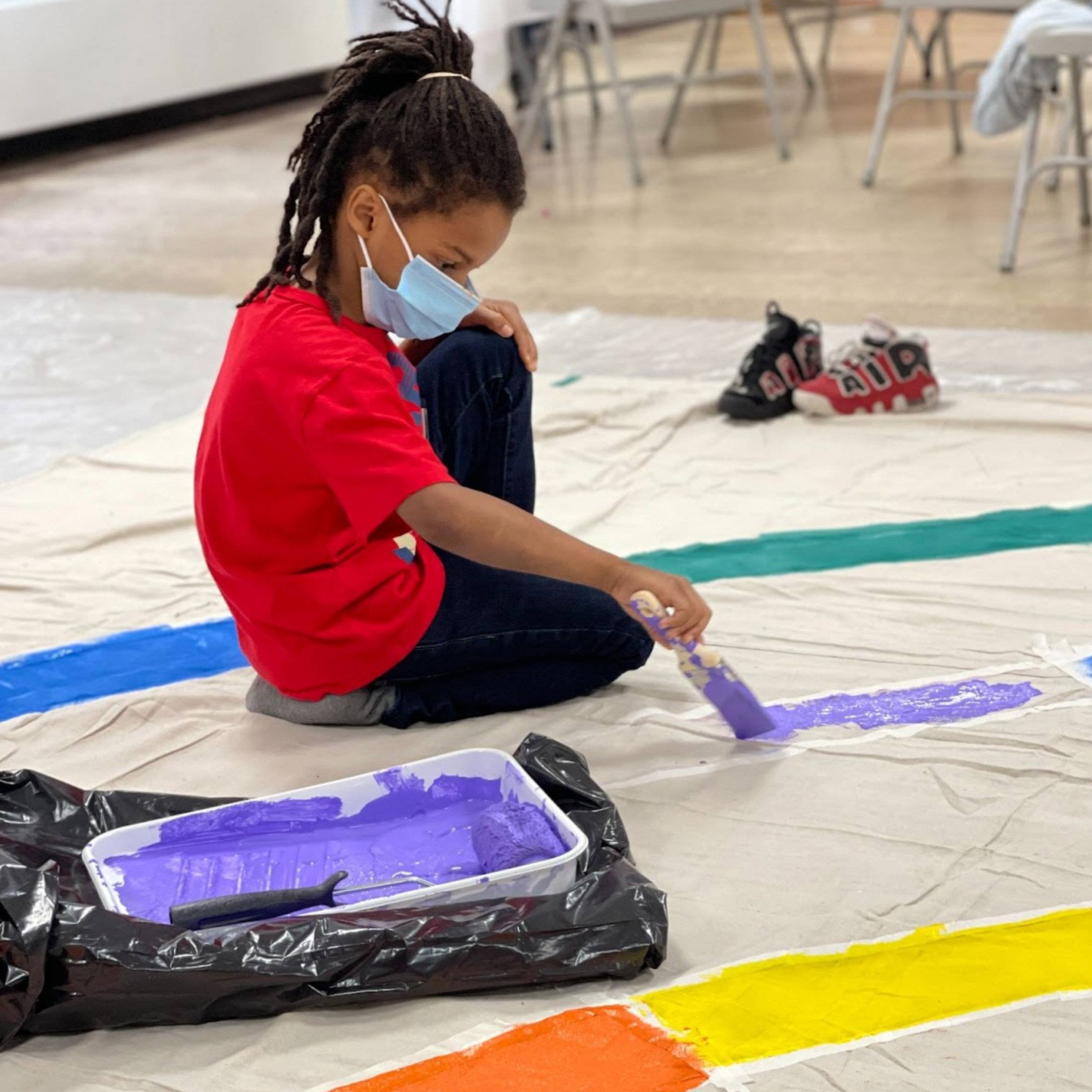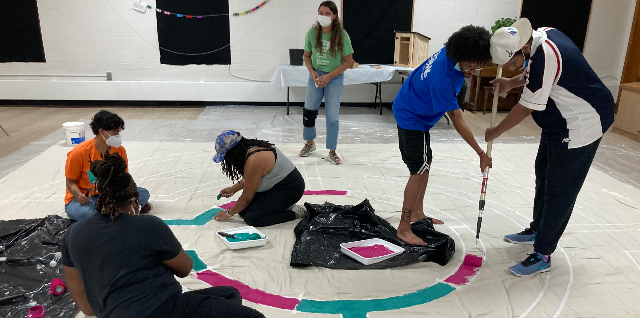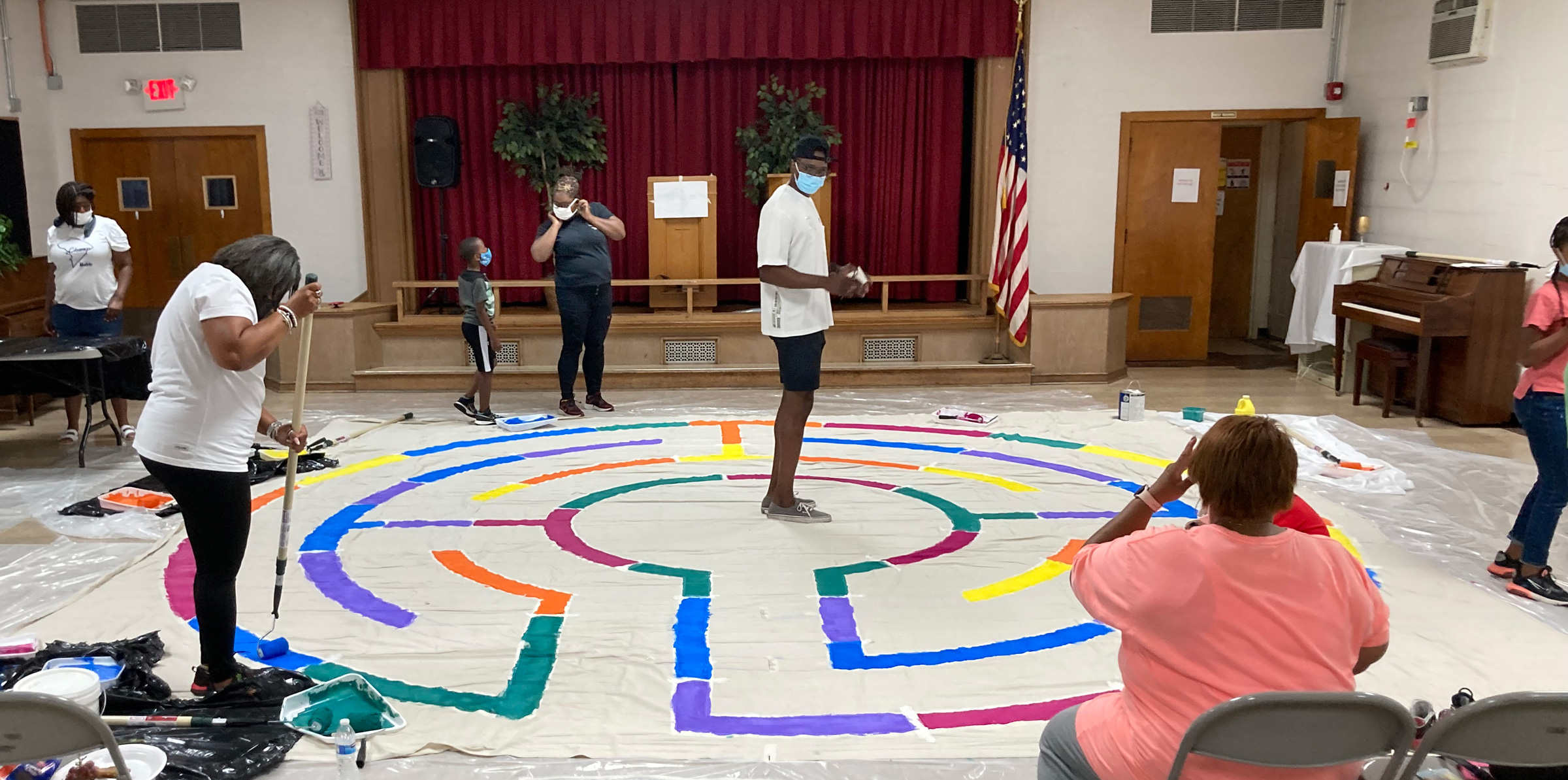 Church members and residents in the broader community worked together to paint the church’s walking labyrinth banner that NDC helped design. The event was an opportunity for people to engage in a mapping activity and share ideas.
