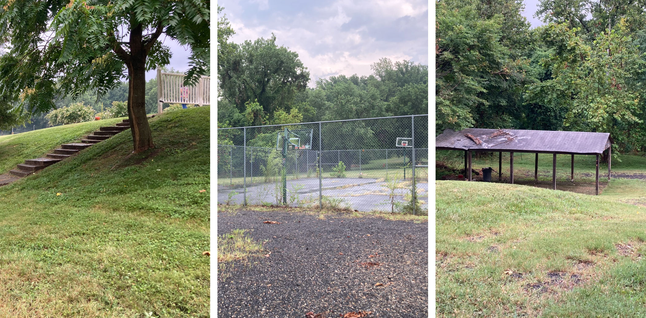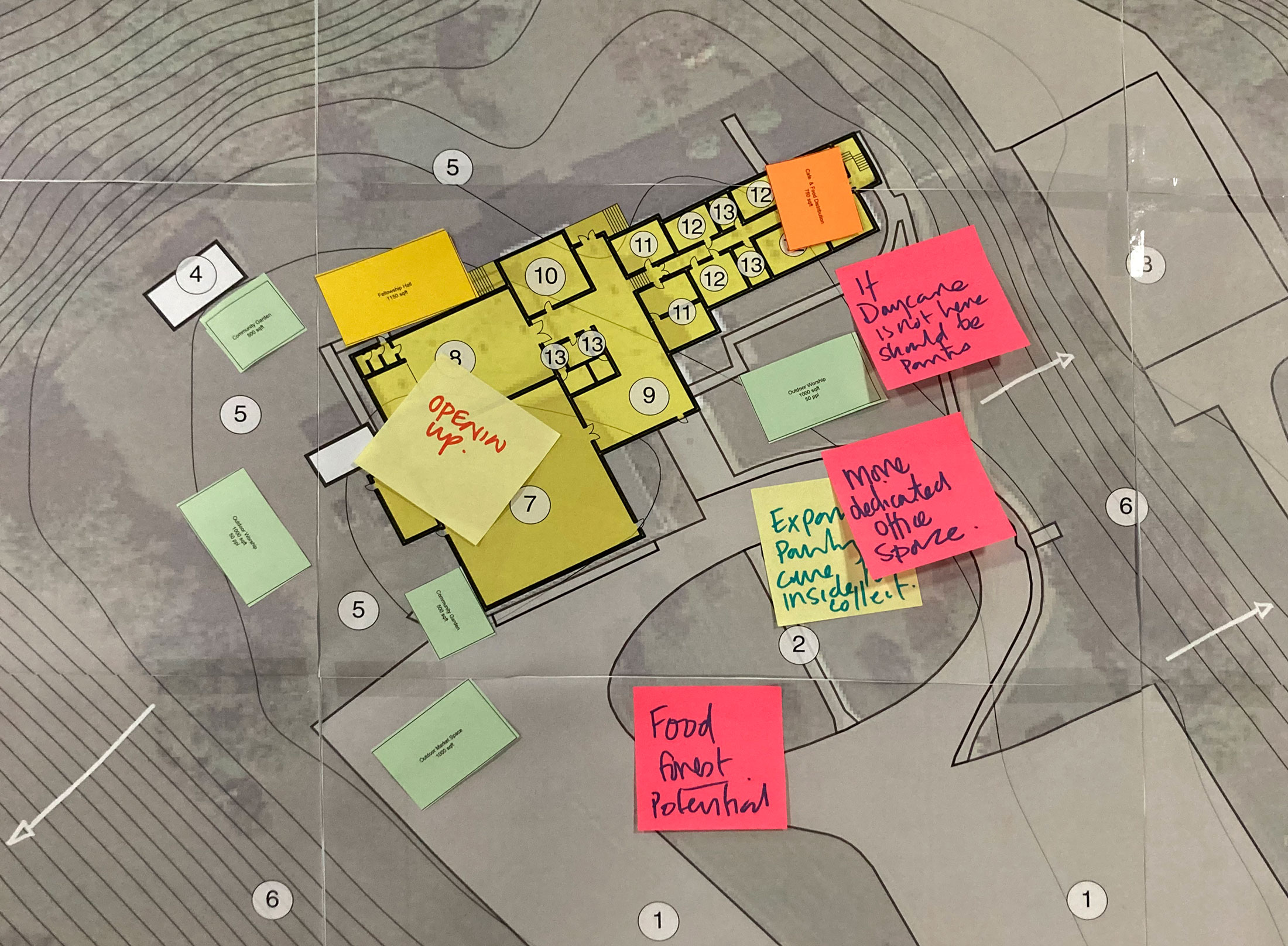 The NDC team analyzed existing conditions, zoning and use, and feasibility for future development. While the streams and slopes create development constraints, there is still space to create outdoor gathering spaces, additional parking, a resource center, and open spaces for gardening or outdoor activities.