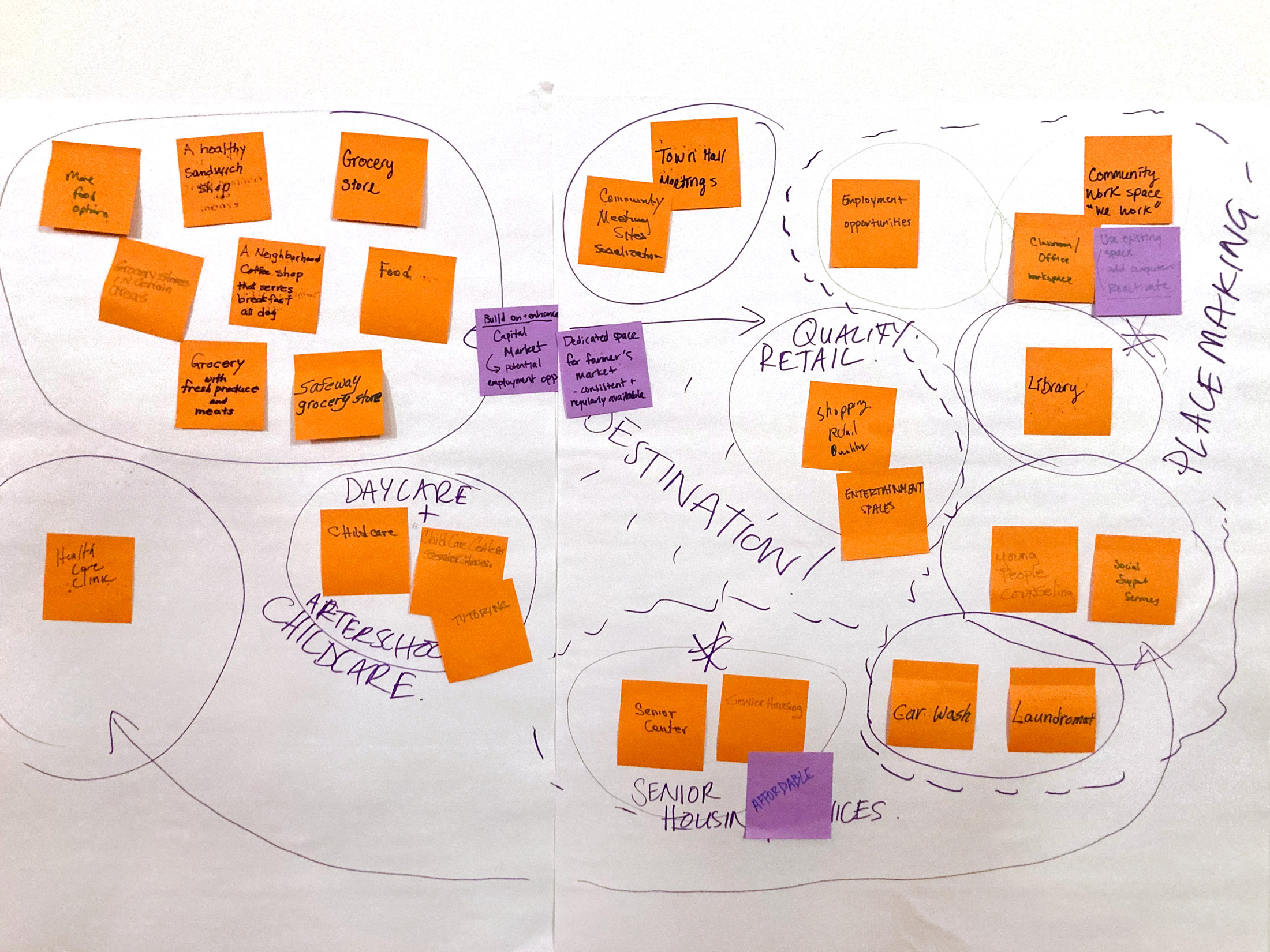 A list of needed spaces emerged, including spaces for youth activities and programming, community gardens and green space, a food hub, senior or multifamily housing, a health center, and a resource center or library.