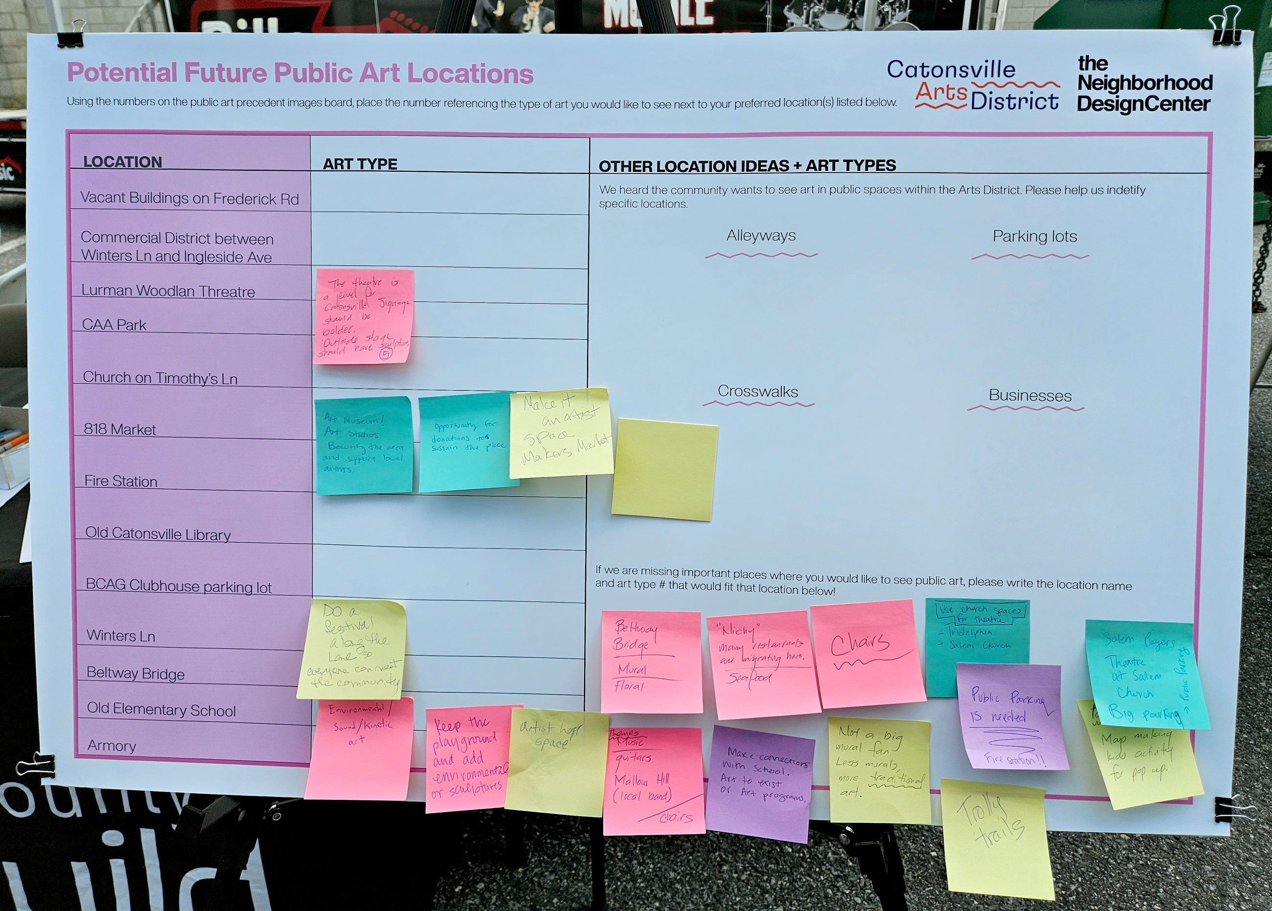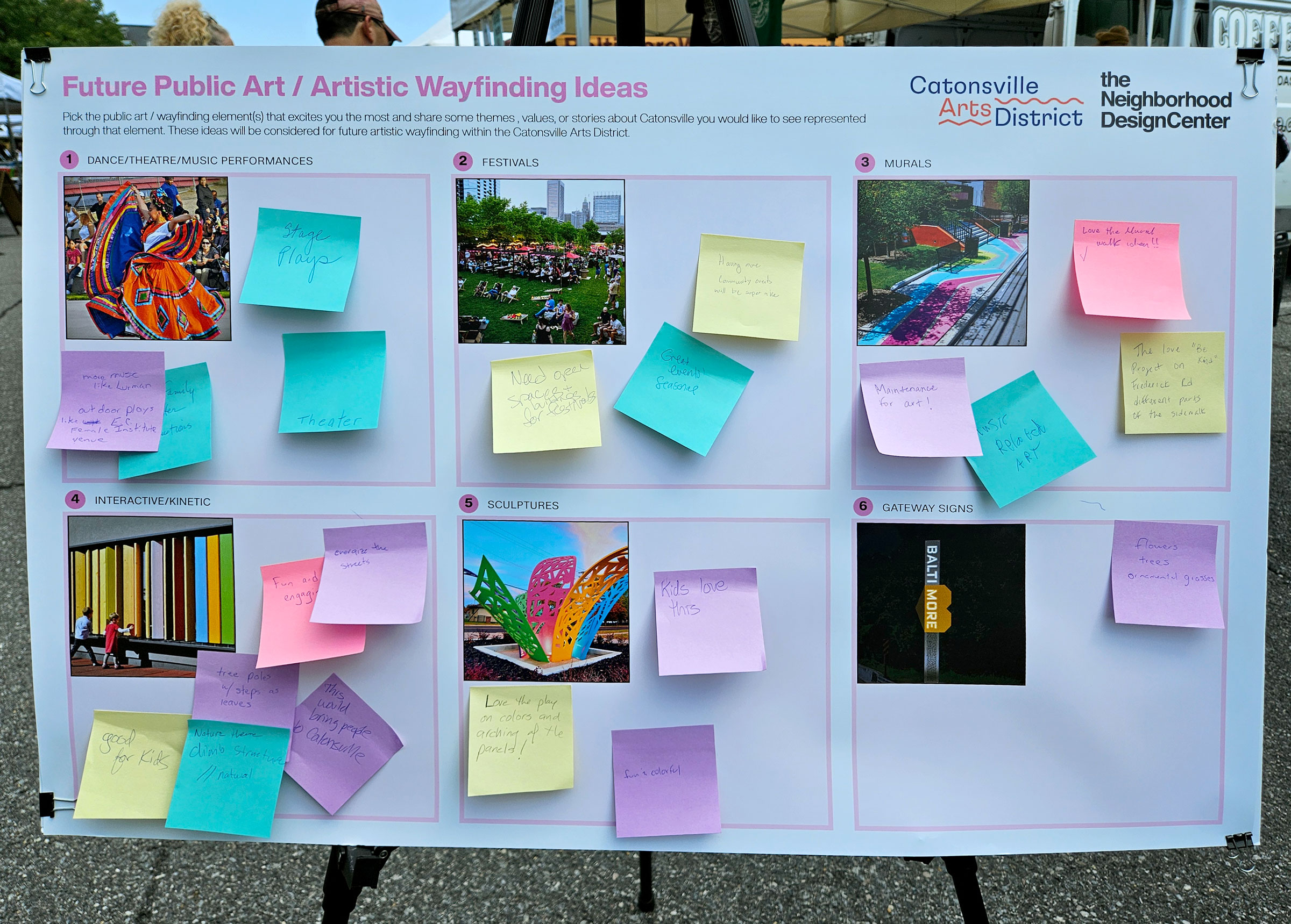 NDC is partnering with the Baltimore County Arts Guild to engage the community in shaping the future of Catonsville’s wayfinding elements. Together, we’ll explore themes, events, and local landmarks to inspire public art, signage, and landmarks that reflect the rich character of this area.