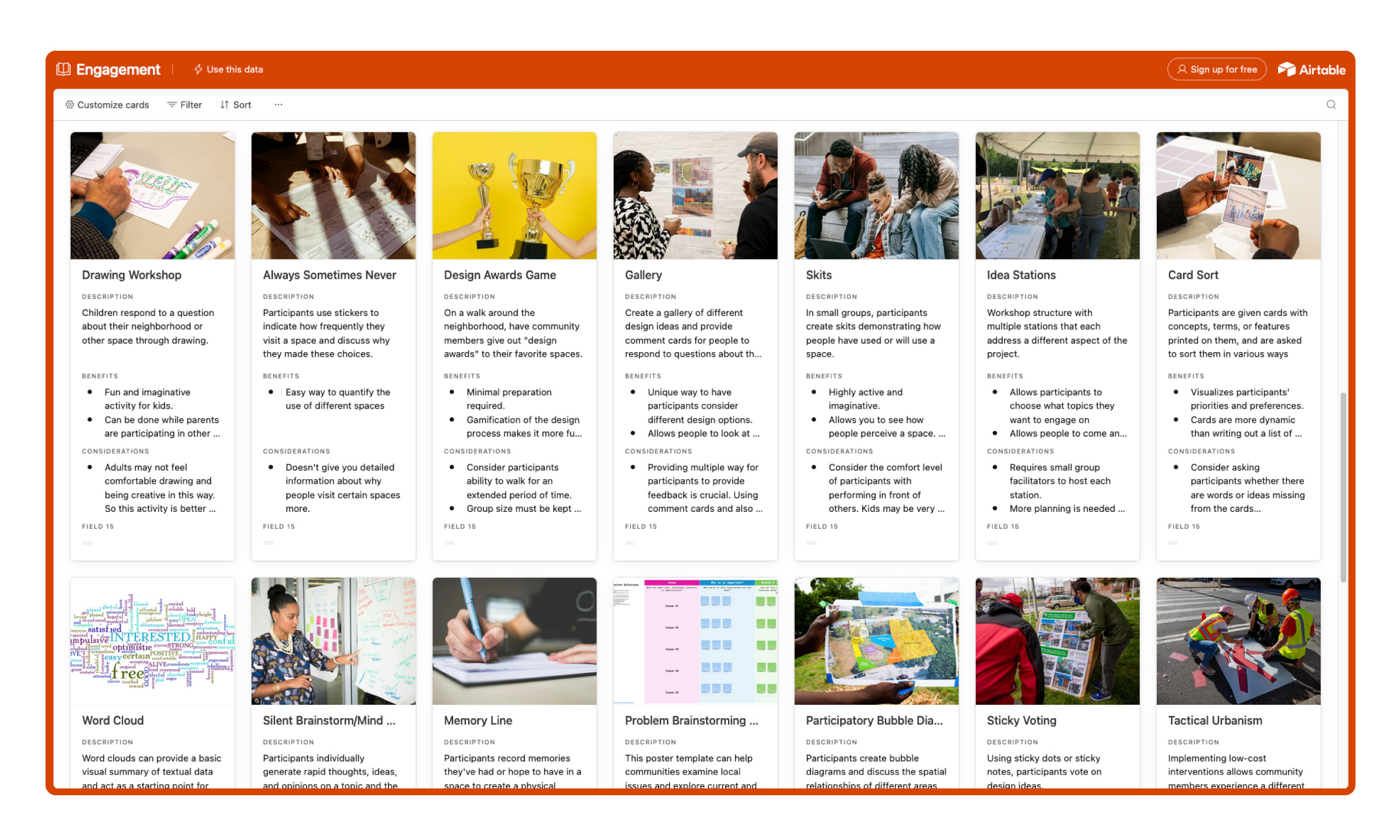 There are many possibilities for engagement activities, and the methods listed in the database are meant to provide a starting point. The activities and instructions can be modified to fit the needs of each project. Most activities are inspired by or pulled directly from other engagement toolkits and designers.