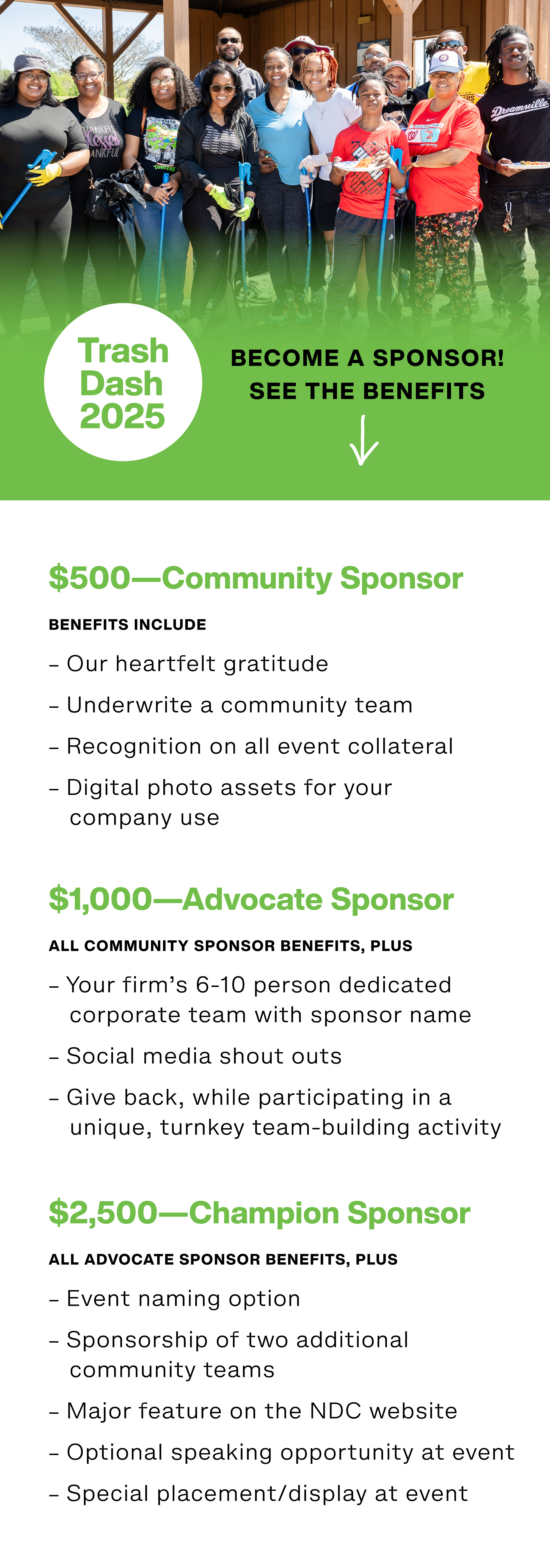 Teams of 5-10 will work together to clean up trash and debris at this beloved park along the Patapsco River — all while engaging in a friendly competition to see who can clean up the most trash, and raise the most funds for NDC!