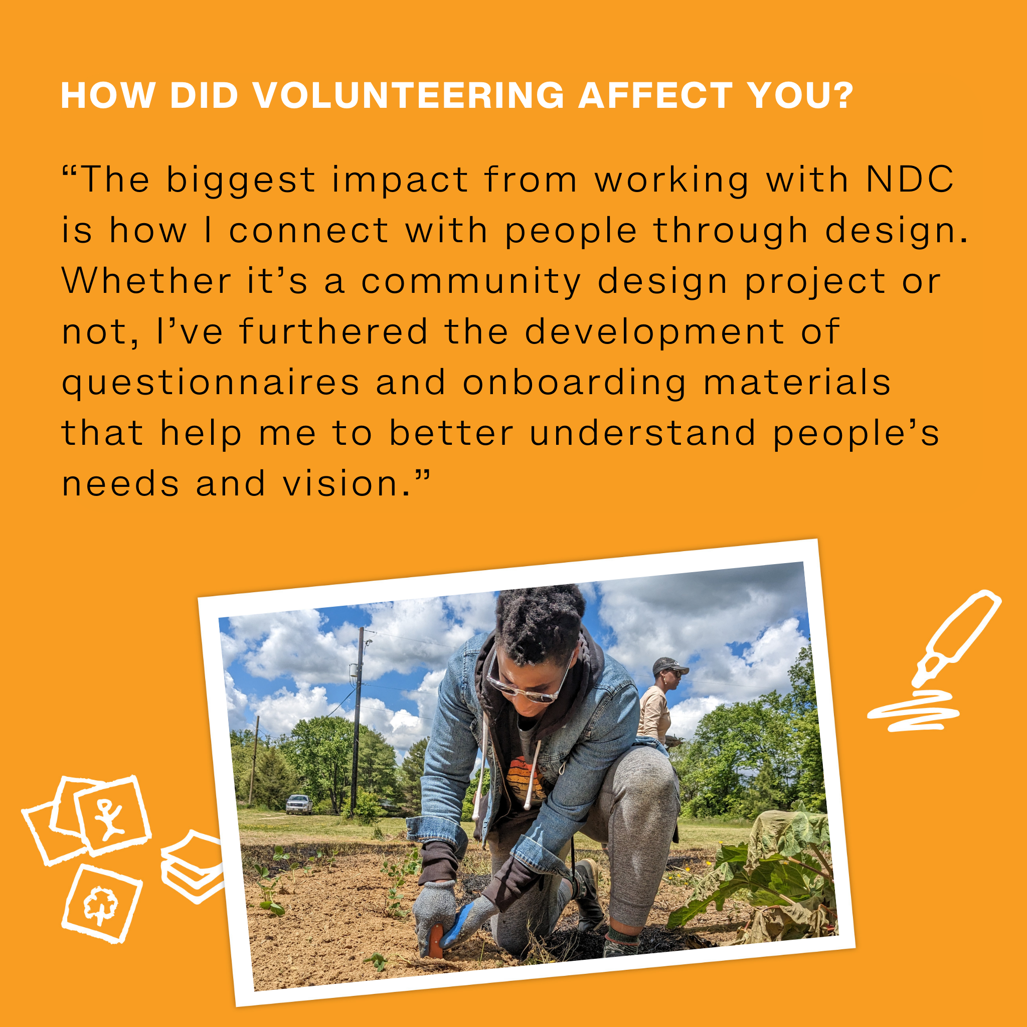 Since volunteering with NDC, Portia has become even more passionate about her involvement with the community. “Especially with the black farming and outdoor community. It has deepened my connection with this land and its history. A lot has changed this past year as it relates to what I eat, how I think, the amount of time I spend outside, and how I design. I’m especially excited that one residential project this year will incorporate strawbale as a natural building material.”