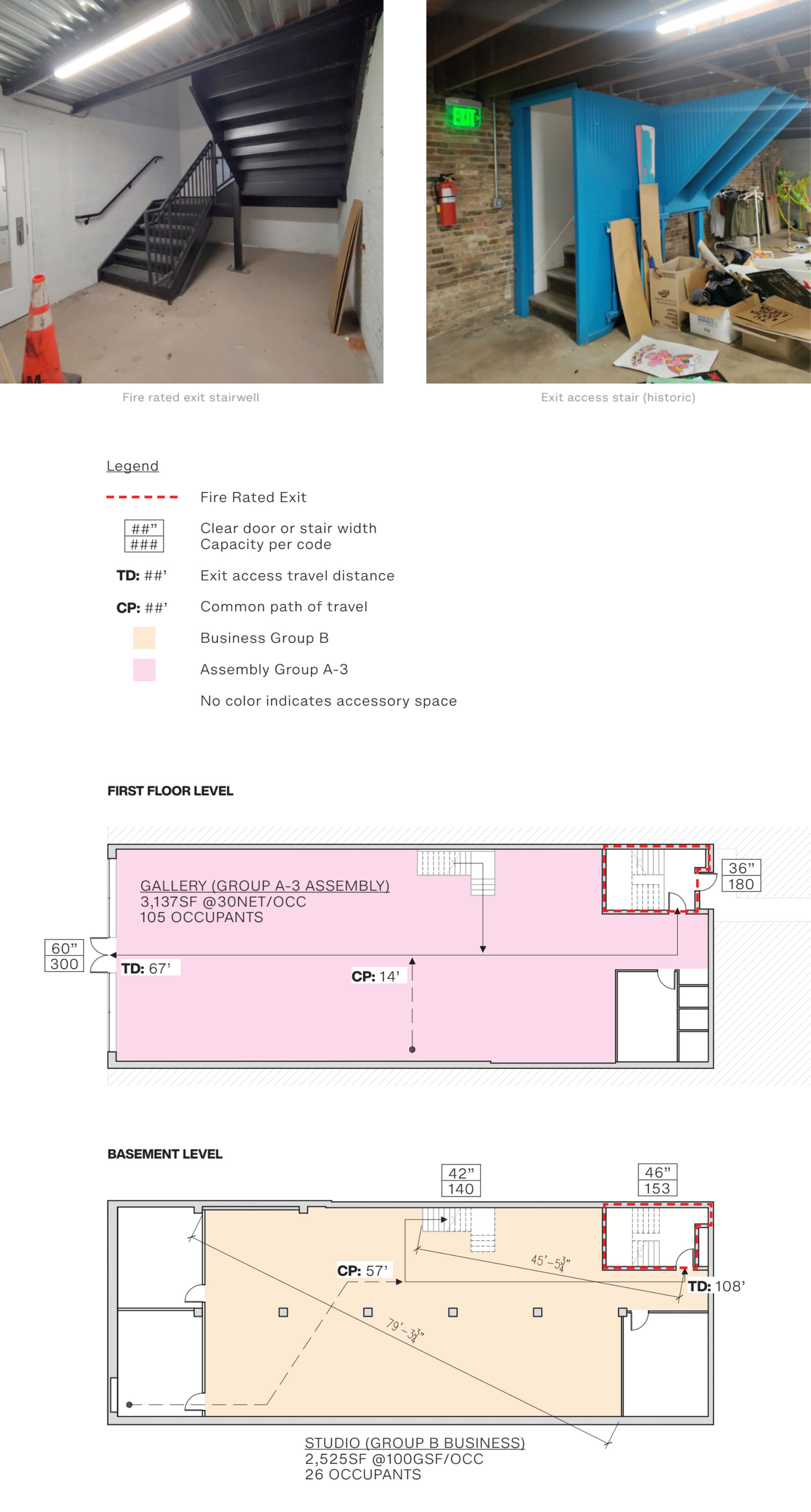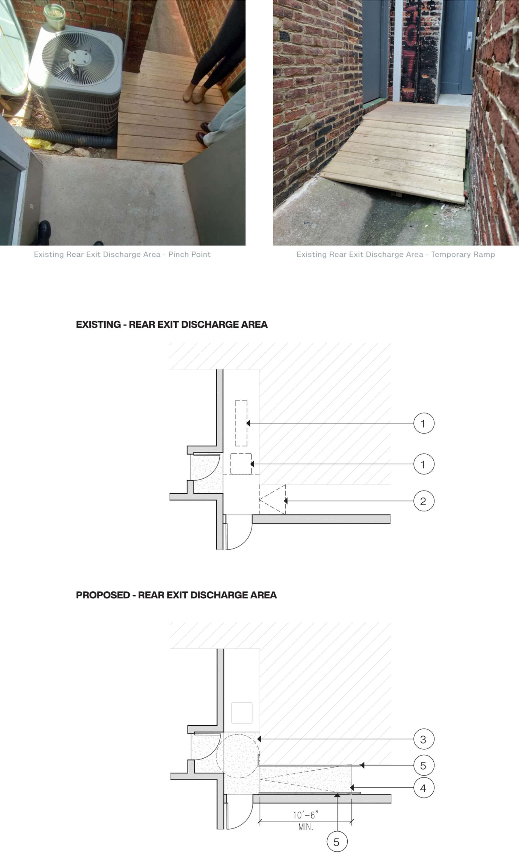 The project also included reimagining the rear exit discharge area. While a temporary ramp and landing addressed accessibility concerns, NDC proposed a more durable and spacious alternative to meet modern standards. These plans addressed compliance challenges while enhancing the building’s overall functionality and safety.
