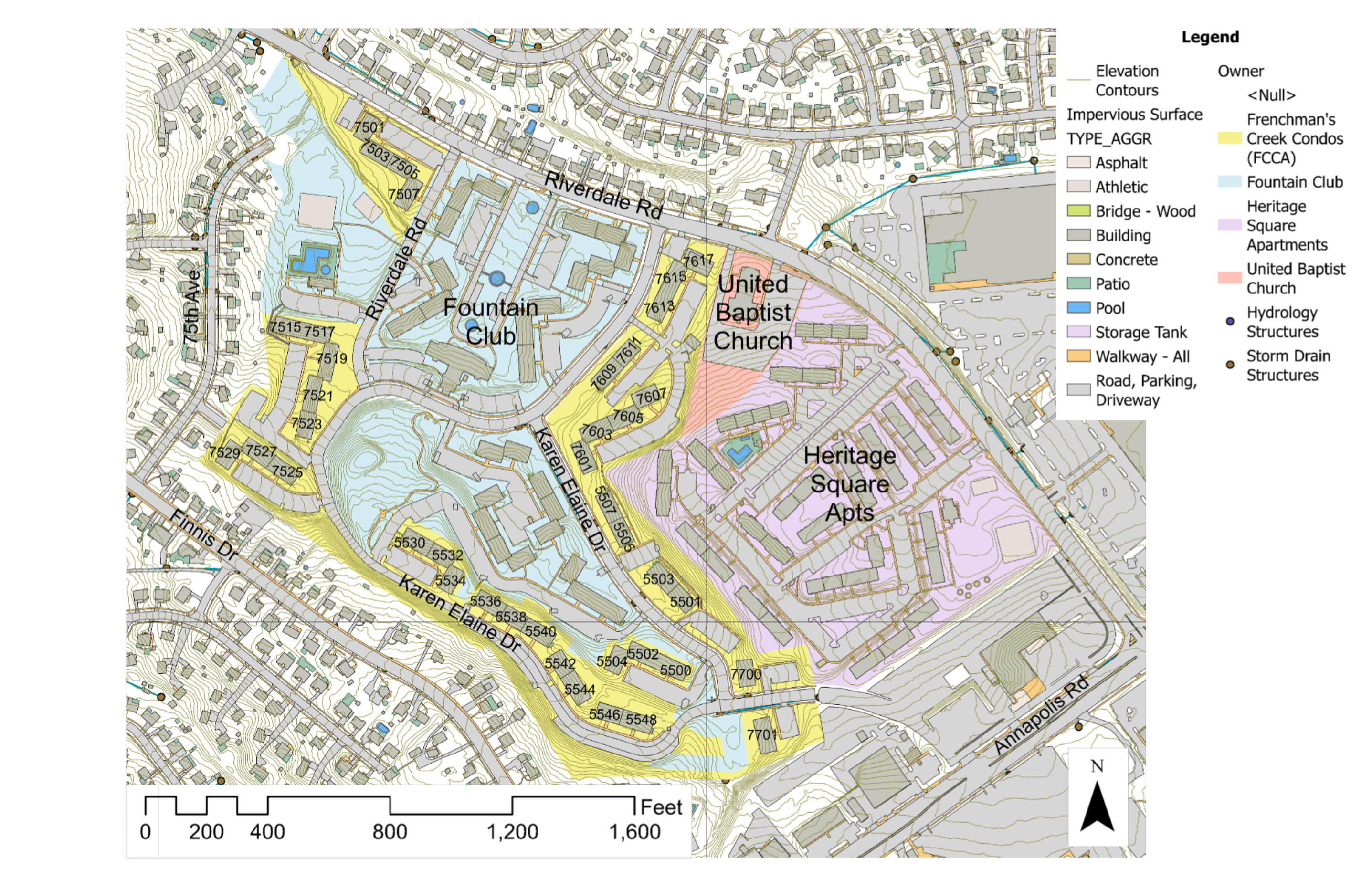 The Frenchman’s Creek Condominium community in New Carrollton, MD, faces growing stormwater problems, including flooding, erosion, and property damage. The parking area near Buildings 7607, 7605, 7603, and 7601 is in disrepair, with a failing retaining wall, cracking pavement, and heaving walkways.