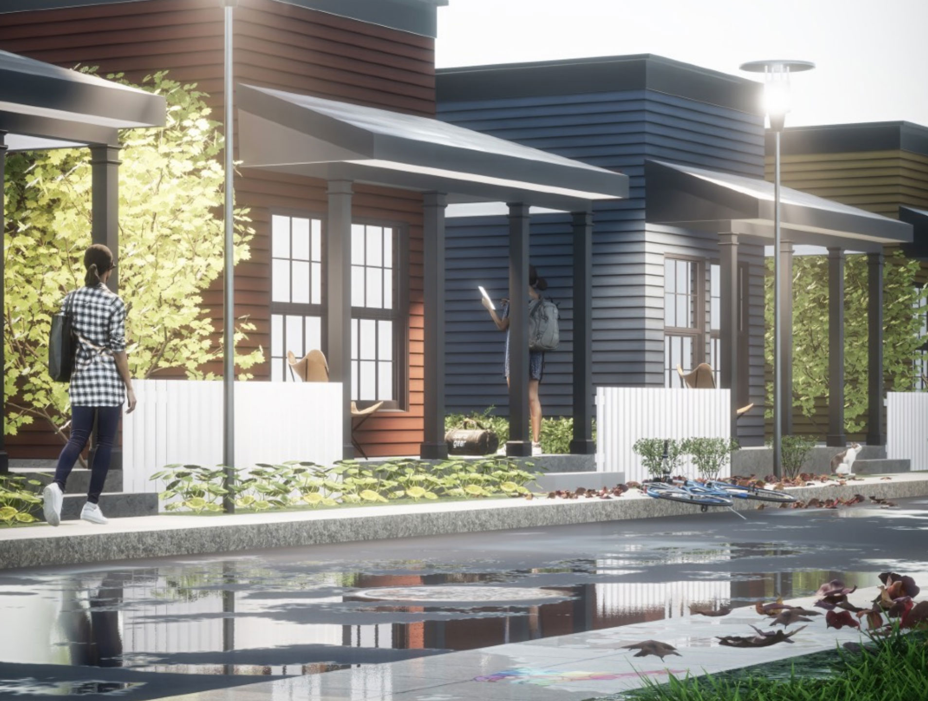 It is a privately funded community of thirteen fully-furnished, 400-square-foot, single-family homes with wraparound porches and side yards created for homeownership for working, extremely low-income people or families who have experienced homelessness. The commercial developer is covering the difference between the actual cost and the sales price ($25,000) to the future homeowners.