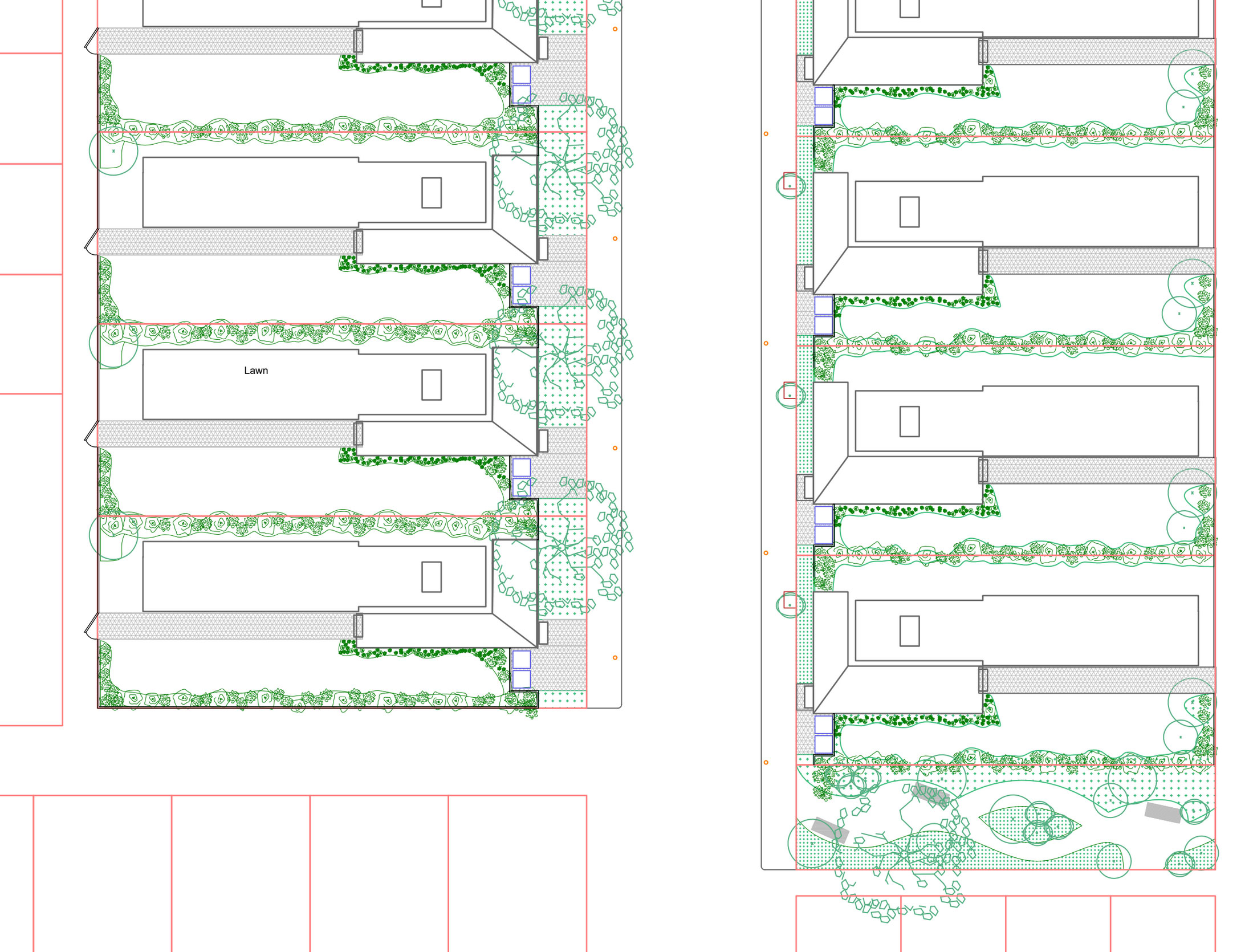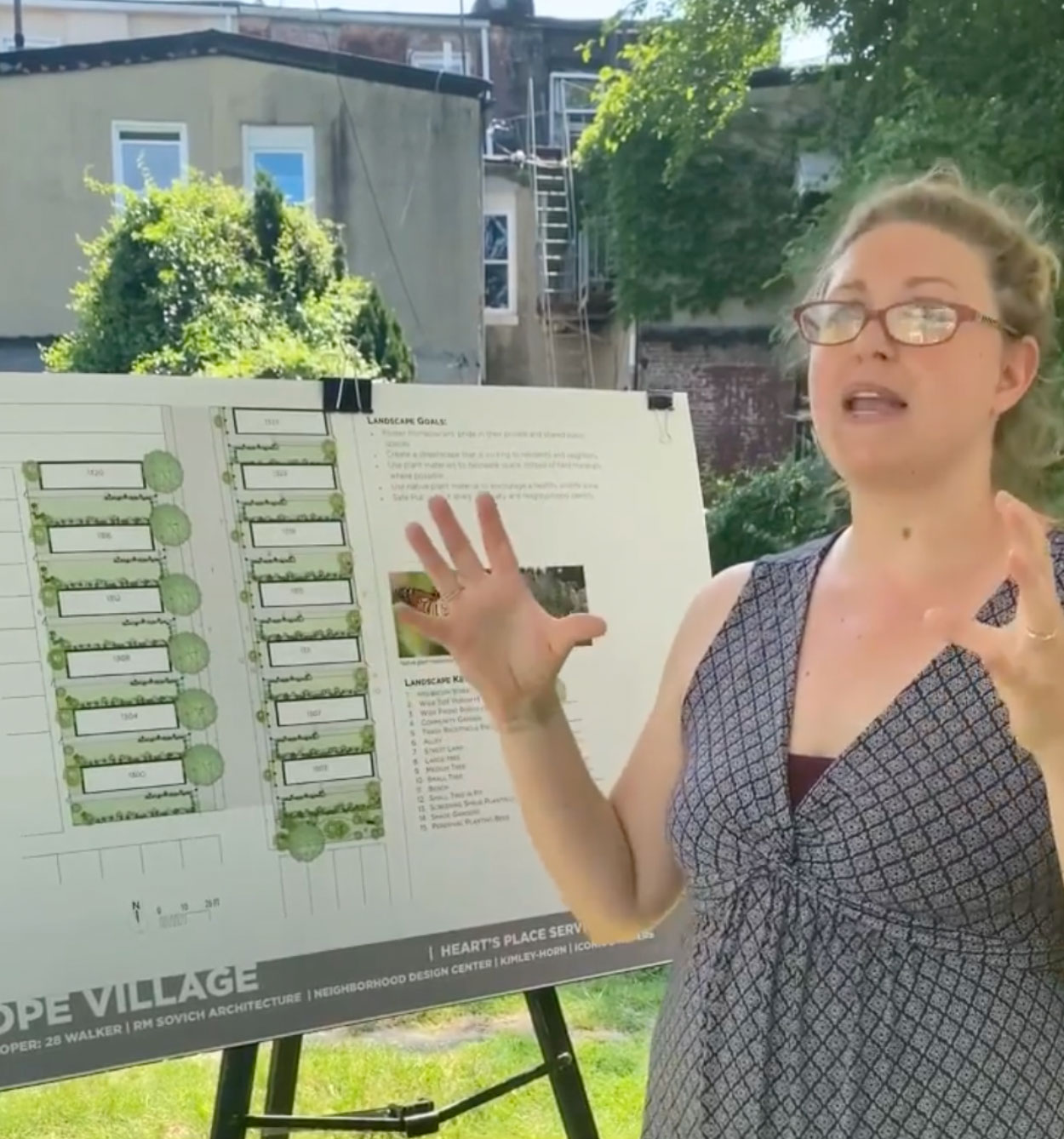 Our designs include street trees and lighting, native plantings that are easy to maintain, a community garden, and turn an alley into a residential street through sidewalks.