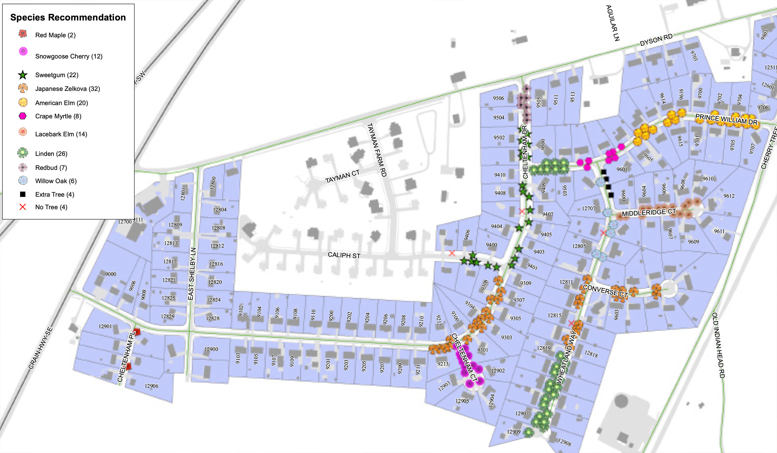 In addition to increased canopy on school grounds, in support of the Department of Public Works & Transportation’s Right Tree Right Place Program, NDC created street tree planting and removal plans for nine different neighborhoods in council district nine, Prince George’s County.