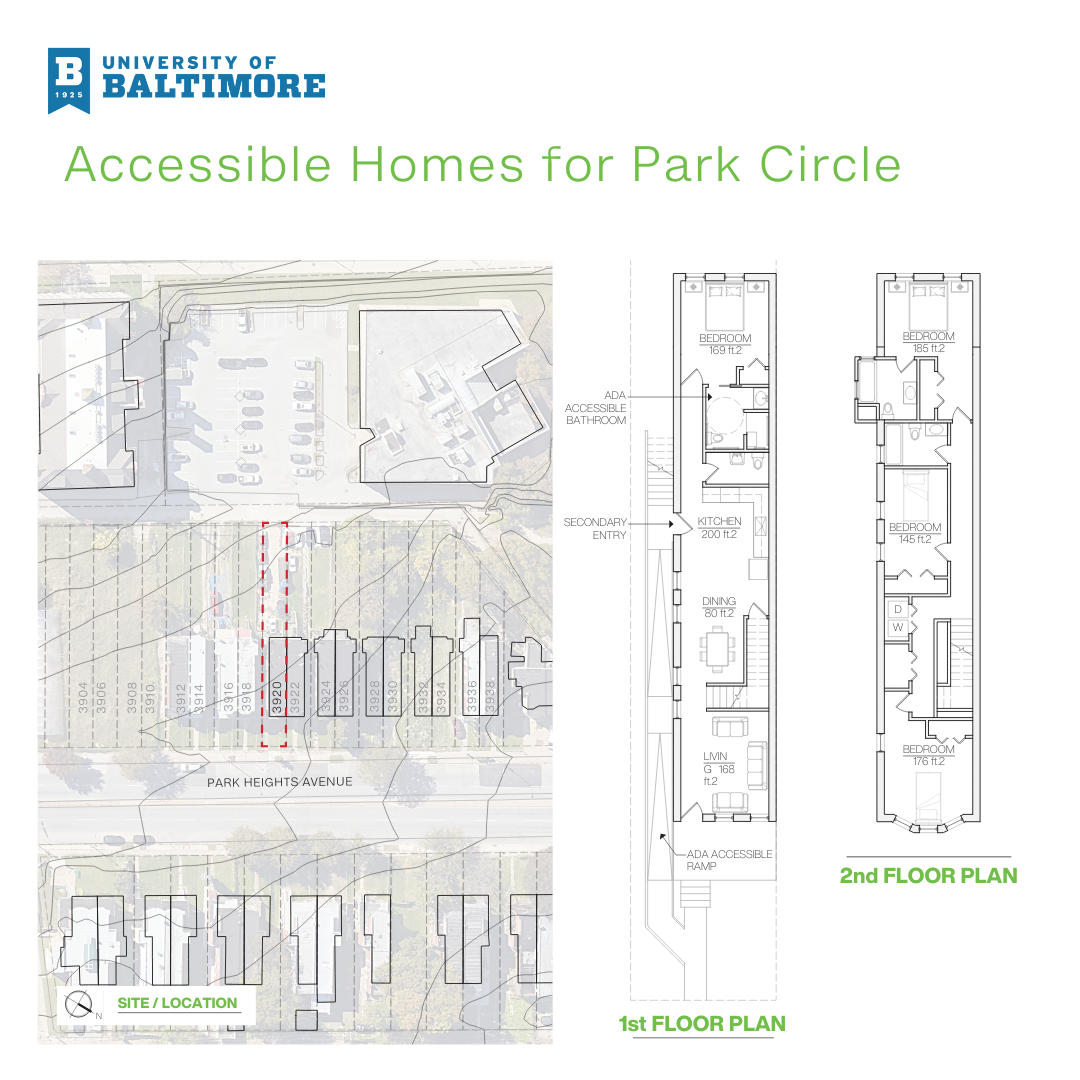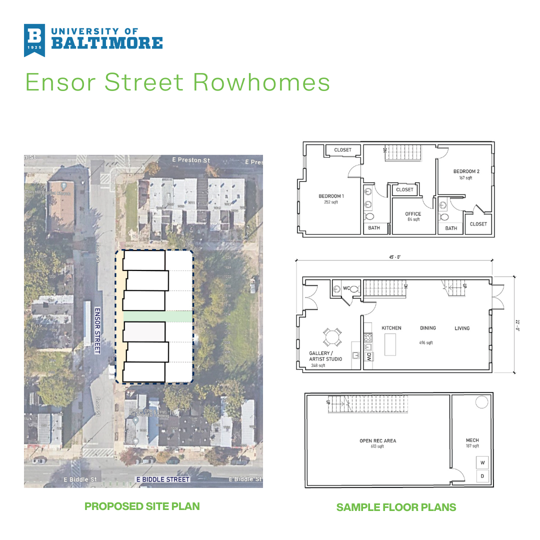 This project aims to establish an artist community on Ensor Street by combining 2 plots to create 6 2-story townhomes with a greenspace alley. Each townhome includes 2 bedrooms, 2.5 baths, an open gallery/art studio on the first floor, and private bedrooms, baths, and office space on the second floor, along with an unfinished basement.