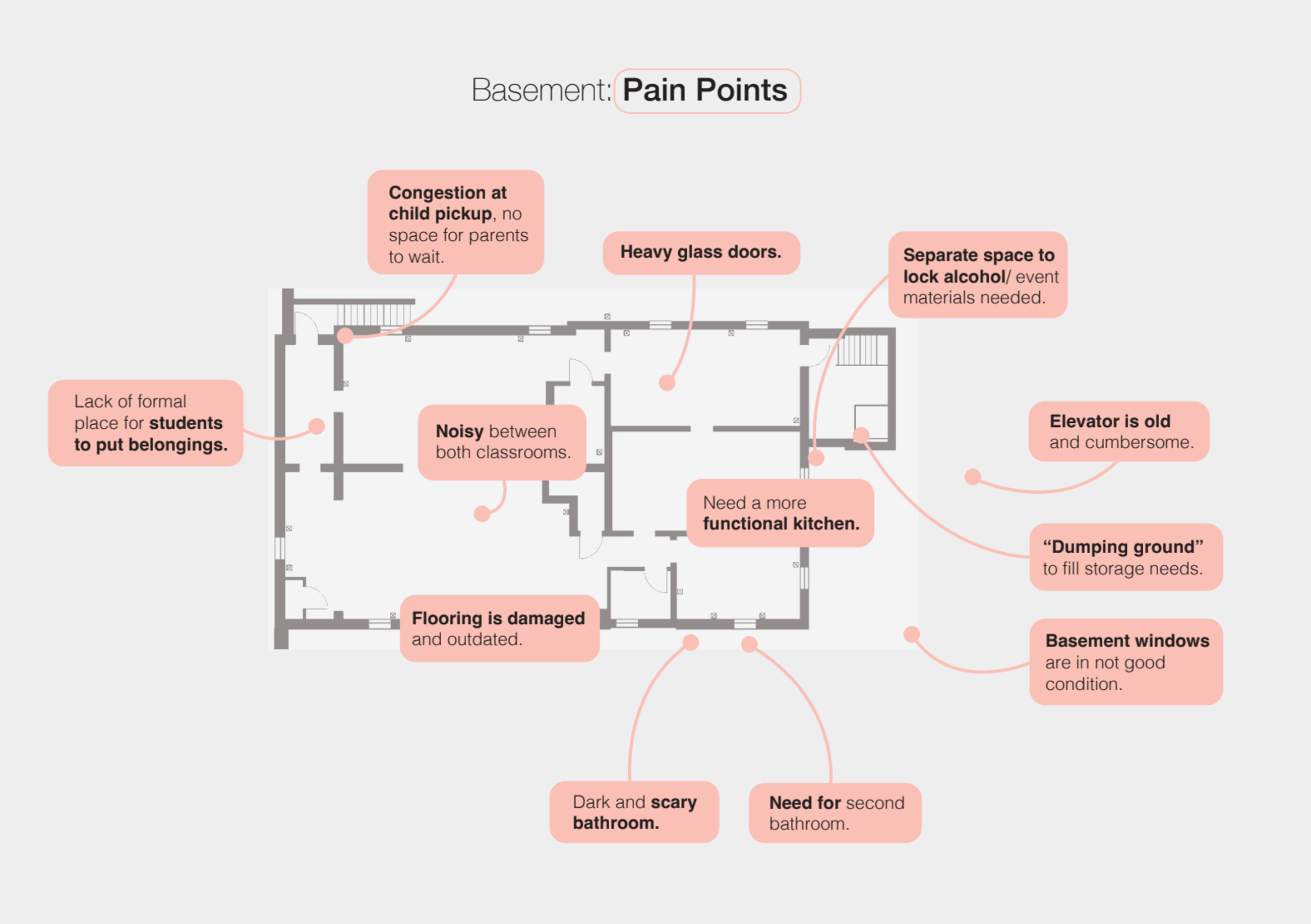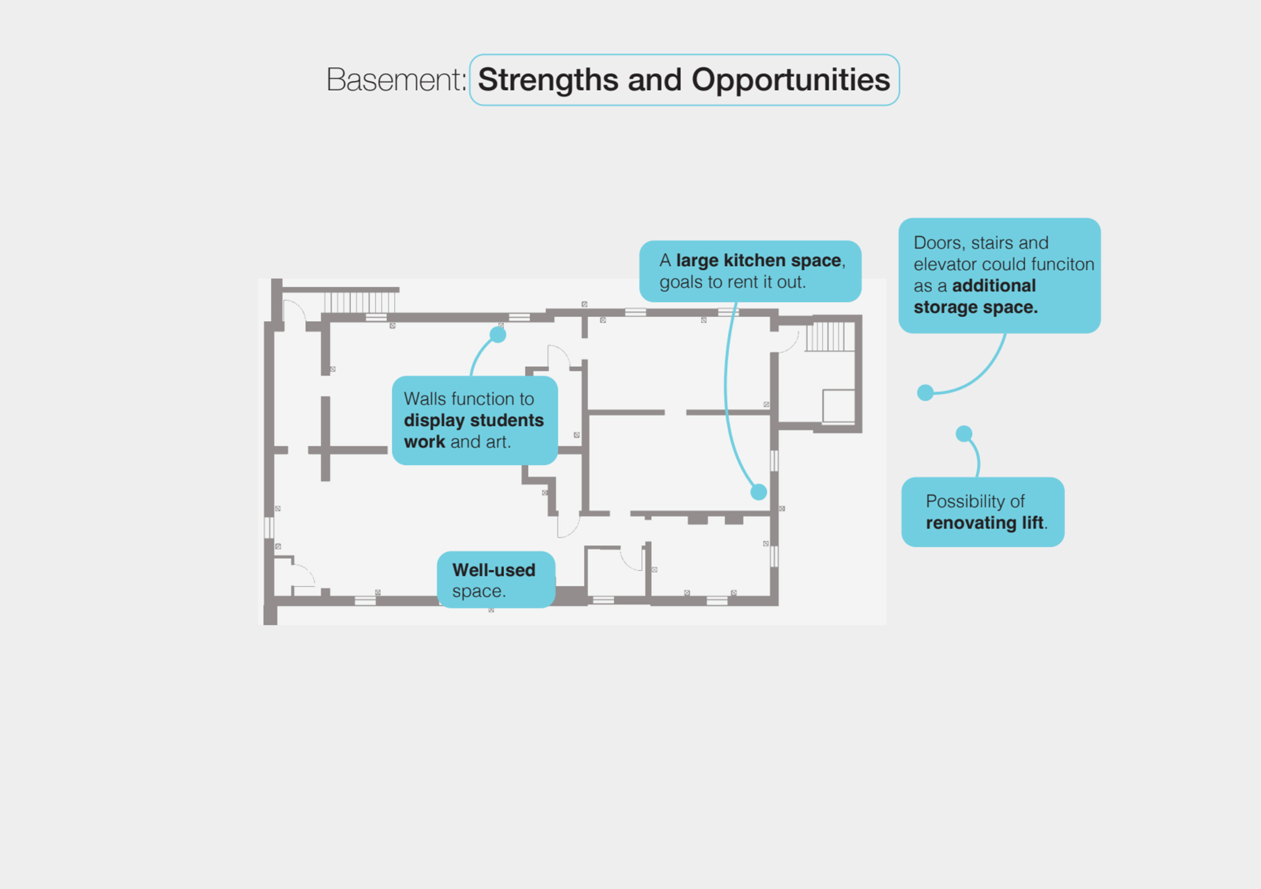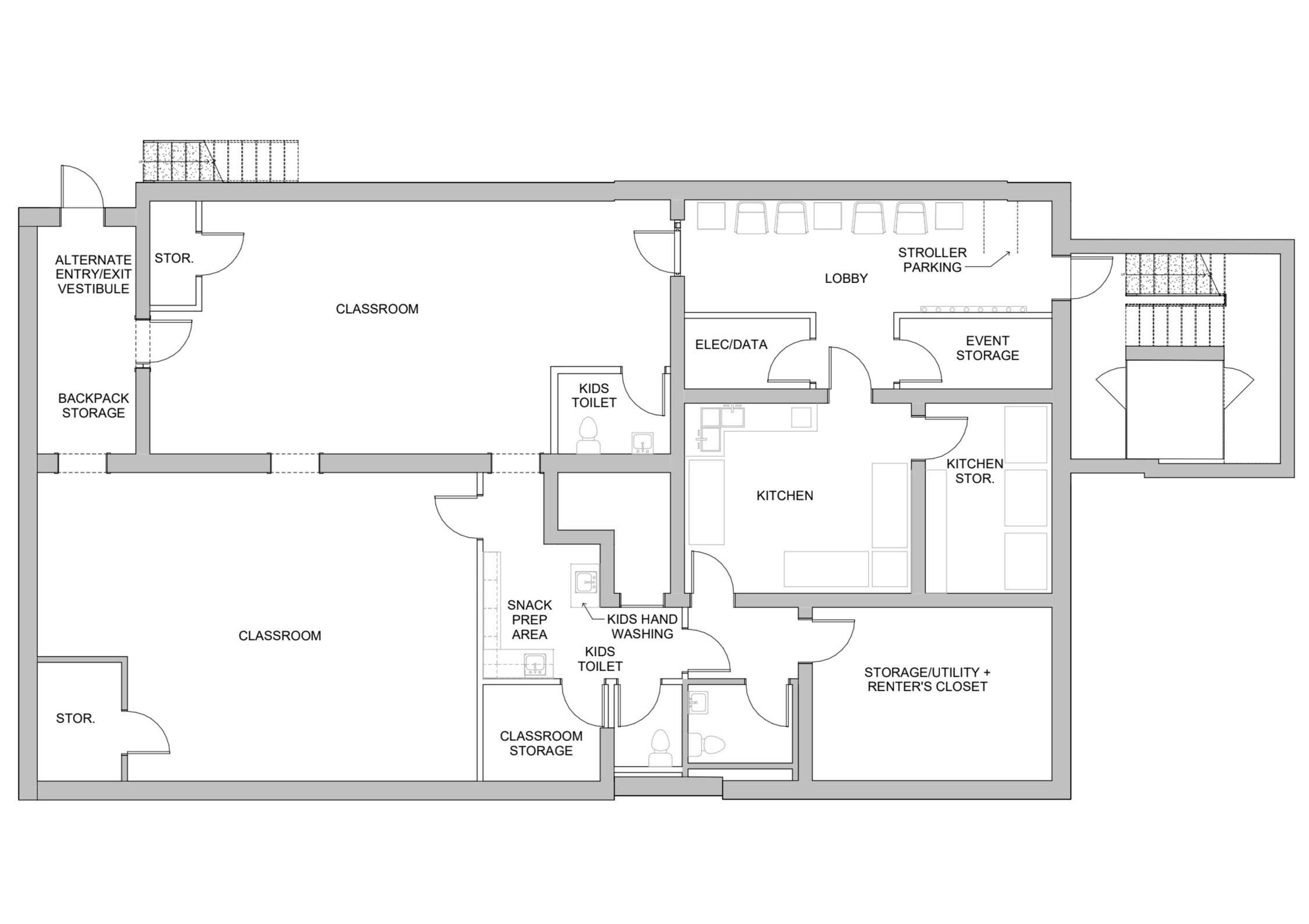 Additional infrastructure for young children in the basement, along with improved storage space, kitchen, and circulation