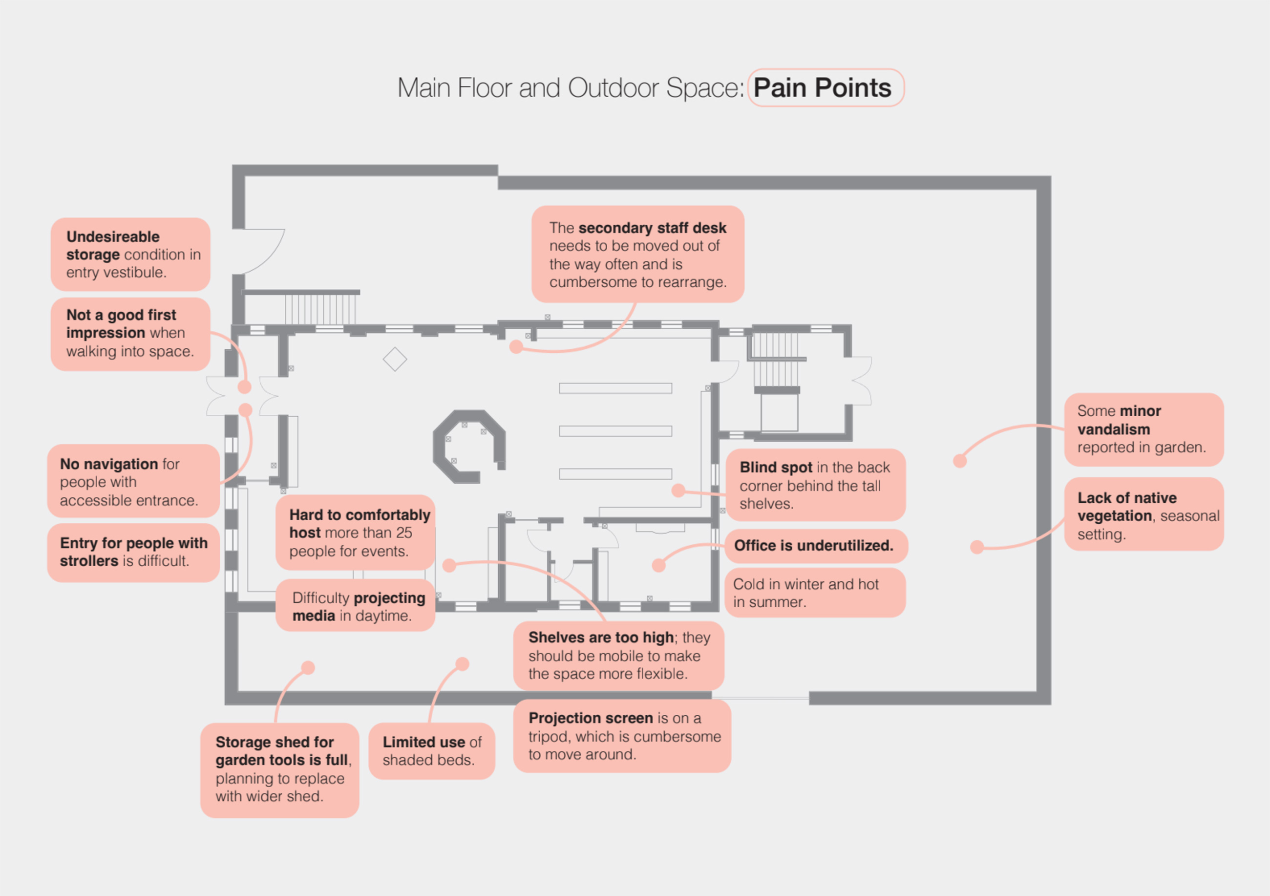 The library is located in a relatively small and historic building located at 2521 St. Paul Street. This posed some interesting challenges and opportunities as we explored ways to showcase their diverse programming, and improve the accessibility, security, and sustainability of the building.